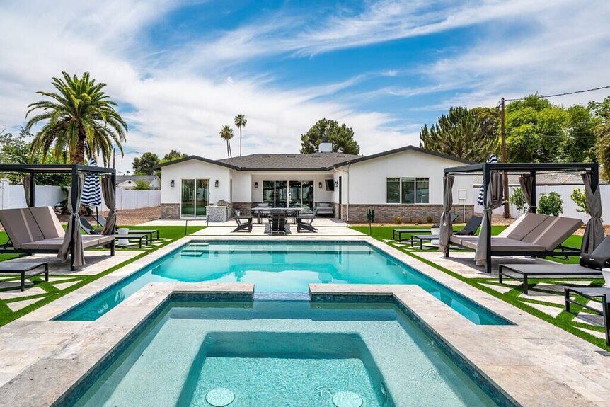 North Phoenix has the highest concentration of newer homes (2000s-2010s builds) with larger lots and modern pool designs. If you’re booking for 8-14 people and need a genuinely large pool with a spa, outdoor kitchen, and multiple covered patio areas, North Phoenix is where to look. Prices run $200-400/night for well-appointed 4-5 bedroom pool homes.